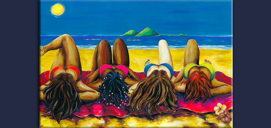 One day, I walked onto North Mission Beach to see four backpackers lying shoulder to shoulder on a sarong, worshiping the tropical sunshine. There was a trail of hats and shoes and outer clothing behind them. It was the happiest and most wonderful scene, I just had to paint it.