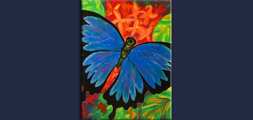 Ulysses Butterfly (Papilio ulysses) also known as the blue mountain swallowtail butterfly or Blue emperor, is a large butterfly with a wingspan of about 14 cm (5.5 in).This spectacular irridescent blue butterfly is found flashing around in rainforest clearings and above the canopy. It also hangs out in gardens as they love brilliant red flowers, especially Ixora's. They are a popular tourism symbol throughout FNQ. The painting is one I photographed on an Ixora in our garden in Mission Beach..